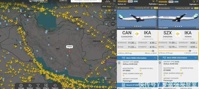 不过呢,有国外网友通过航班信号追踪网站。发现了在伊朗关闭领空的这段时间里,全球所有途经或飞往伊朗的航班,基本都选择了绕道飞行,但有两架飞机却是例外,它们直接穿过了关闭的伊朗领空,直奔伊朗首都德黑兰。